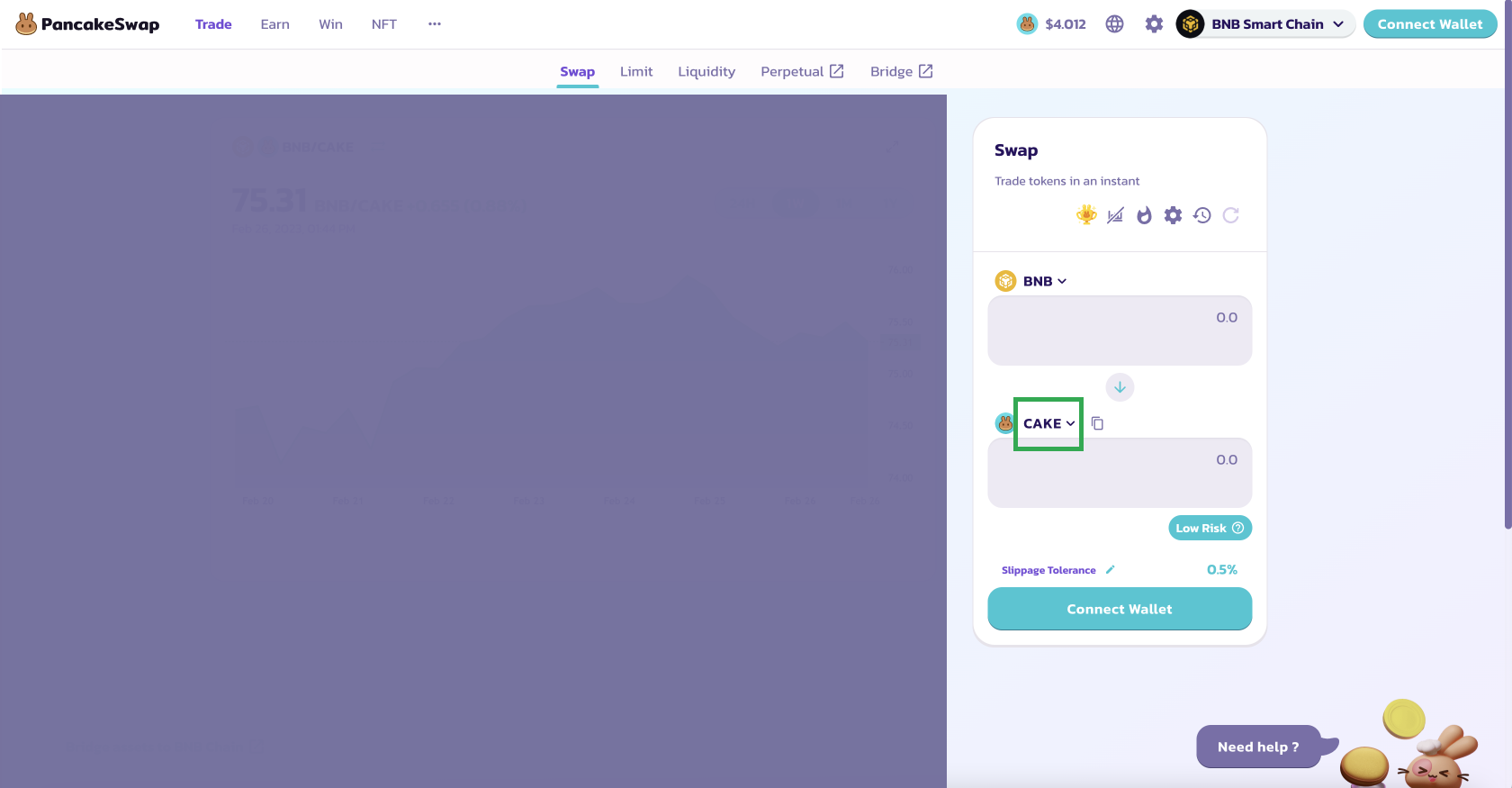 <figure><img src="https://2712062183-files.gitbook.io/~/files/v0/b/gitbook-x-prod.appspot.com/o/spaces%2FARiB5soCxfxe9GR2V5h2%2Fuploads%2F1y0ONGSk0bAv0QGUqCmC%2FGroup%20297.png?alt=media&#x26;token=b4b23c2c-1b17-4fce-9717-cd1fcd839c5c" alt=""><figcaption><p>Click on "CAKE"</p></figcaption></figure>