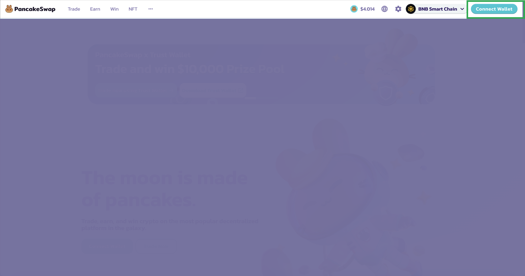 1. Click the **'Trade'** button on PancakeSwap.&#x20;